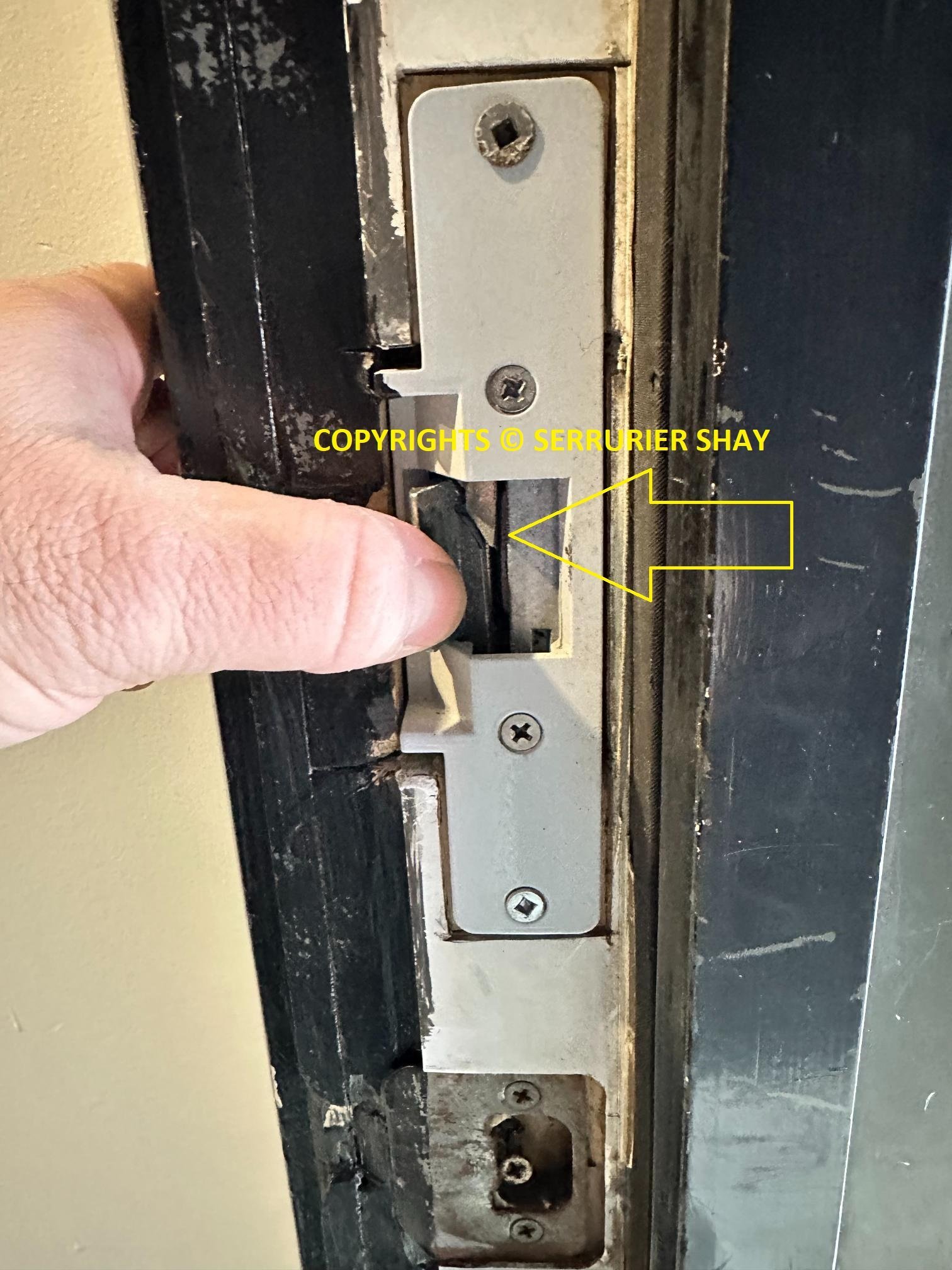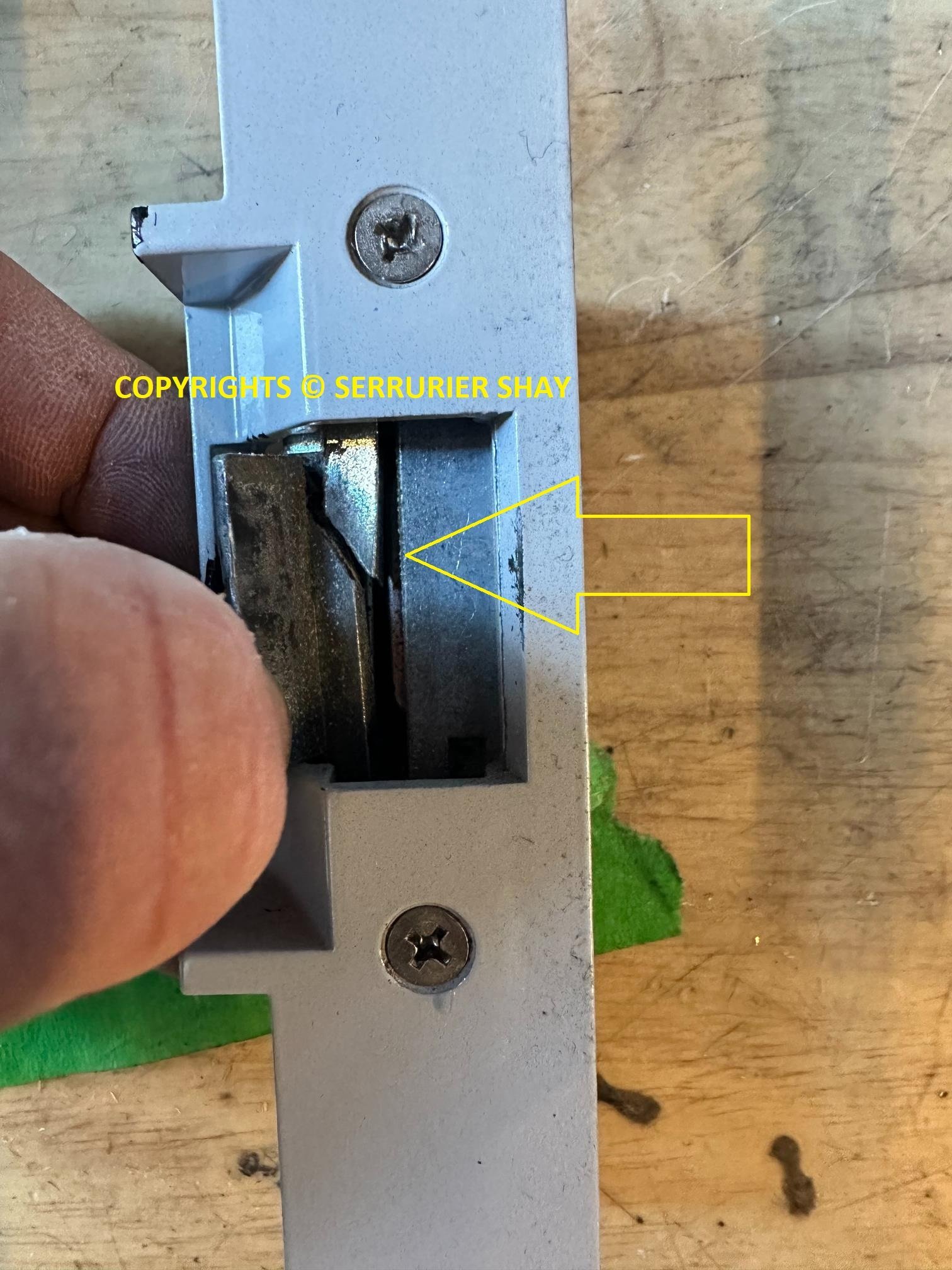 Le loquet (lèvre) de la gâche casse, comme on le voit souvent après une effraction.