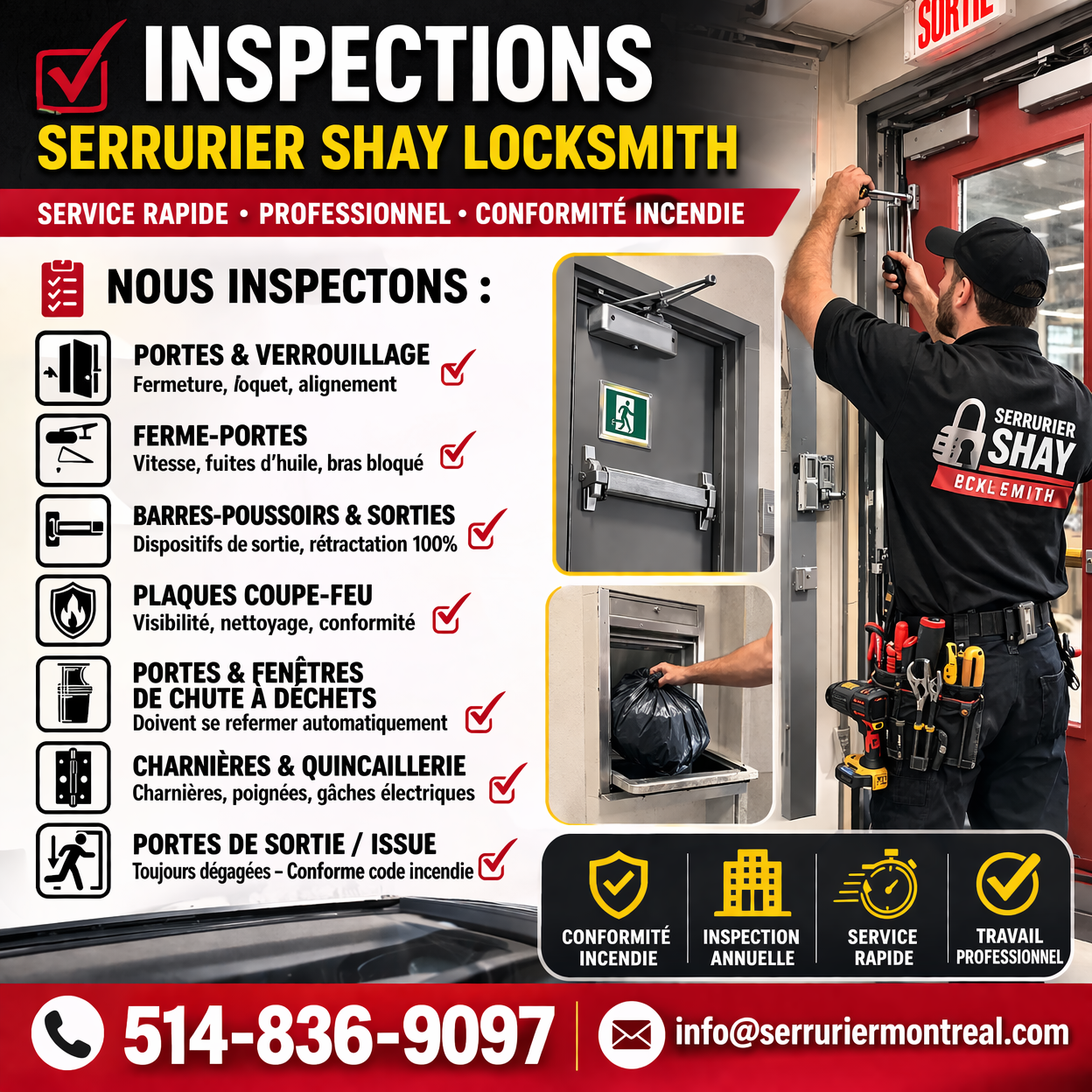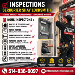 PropriĂ©taires dâimmeubles et gestionnaires immobiliers, attention ! đąđ„ Le service incendie effectue des inspections annuelles pour sâassurer que votre bĂątiment est sĂ»r et conforme. Chez Serrurier Shay, nous sommes spĂ©cialisĂ©s dans lâinspection, la rĂ©paration et lâentretien des portes, afin que vous puissiez passer vos inspections sans stress.